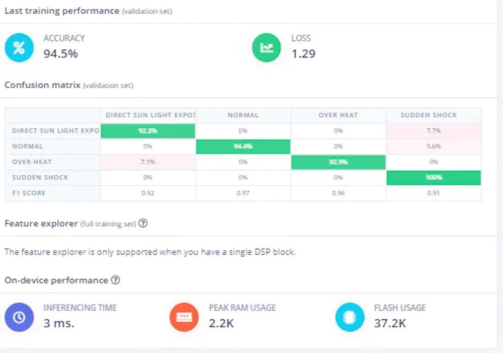 The model was trained on the data that Manivannan had previously uploaded. After training had completed, a validation step revealed that classification accuracy had reached a very impressive 94.5%. After deploying this model to the Thingy:91, it will continually monitor for any problems, and should anything occur, an MQTT message will be sent via a cellular network to provide the shipper with real-time alerts.