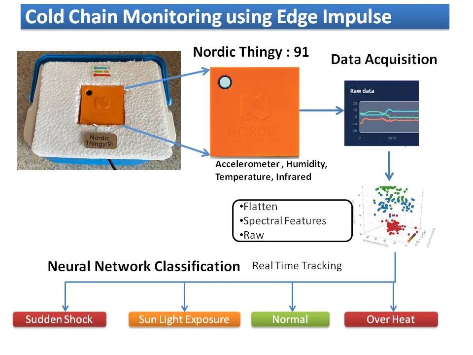 To turn the Thingy:91 into a cold chain monitoring device, Manivannan first flashed it with firmware that enabled it to interface directly with Edge Impulse. With that connection in place, he built a vaccine shipping container and installed the development board inside. While simulating various conditions with ice packs, sun exposure, and drop tests, data from the sensors (accelerometer, humidity, temperature, and infrared) was collected and sent directly to Edge Impulse, where it would serve as training and test data for a machine learning model.