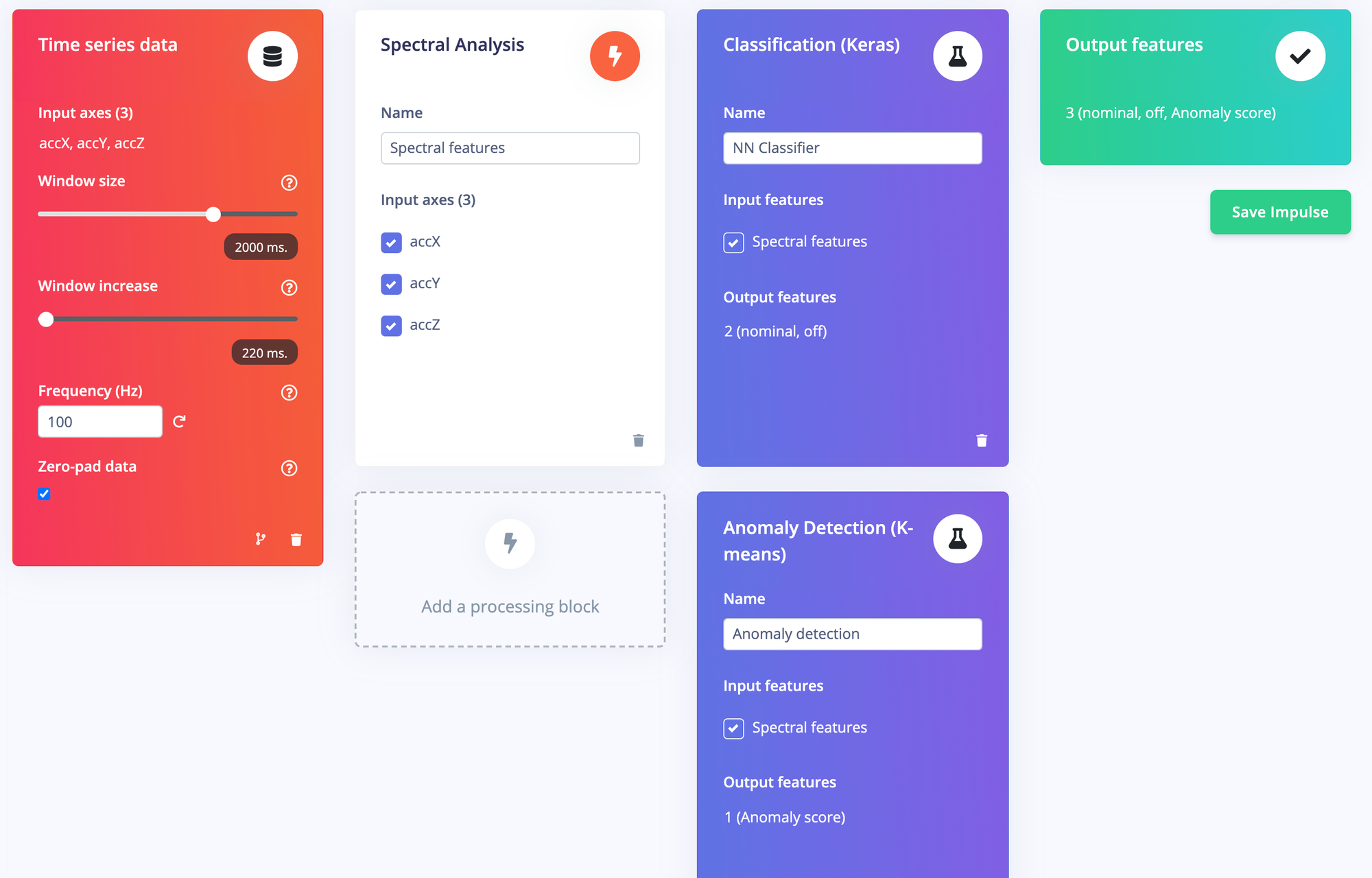 Select automatically suggested features by importance for your industrial sensor data by using your custom digital signal processing block or one of the default DSP blocks provided in Edge Impulse, allowing you to create even more accurate anomaly detection models for new and unseen data based on the most important features of your model’s training data.