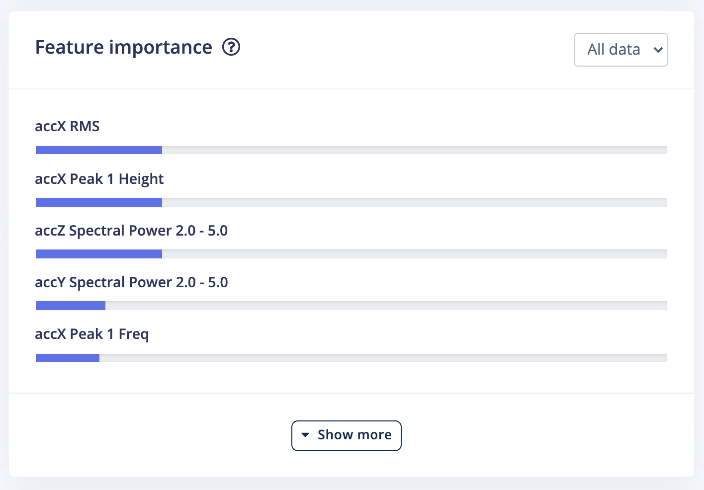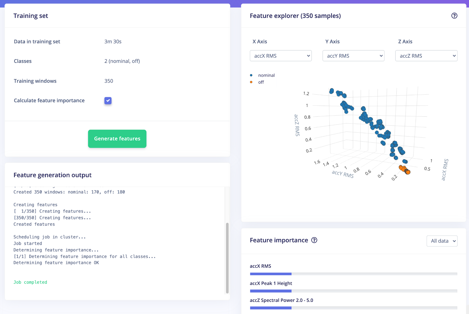 This process of generating features and determining the most important features of your data will further reduce the amount of signal analysis needed on the device with new and unseen data. An obstruction in the fan will create a much different waveform on all three accelerometer axes than a nominal sample; we can use the most important features to more quickly and accurately determine if a new incoming signal is an obstruction or a fan failure, etc.