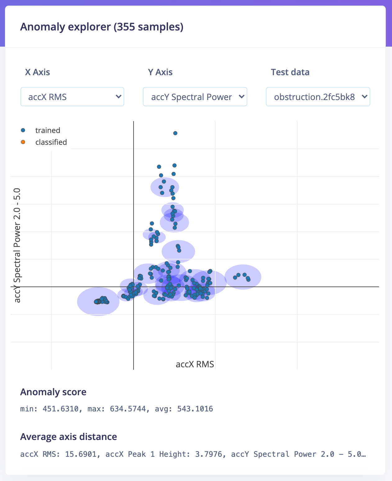 For example, collect training data for a fan vibration monitoring system where your fan is continuously performing nominally. It would be costly and impractical for an industrial-sized fan to purposefully break or get obstructed only to collect training/testing data for a model to detect future fan failure. Instead, collect data of the fan vibrations where the machine operates nominally and when powered off in normal conditions. Upload these frequency and time-based samples into your Edge Impulse project, add a Spectral Analysis DSP block, or your custom DSP code. Generate the features based on your uploaded training data with this code/block. Edge Impulse Studio will then output a Feature Importance graphic that will help you determine which axes and values generated from your DSP block are most significant to analyze when you want to do anomaly detection.