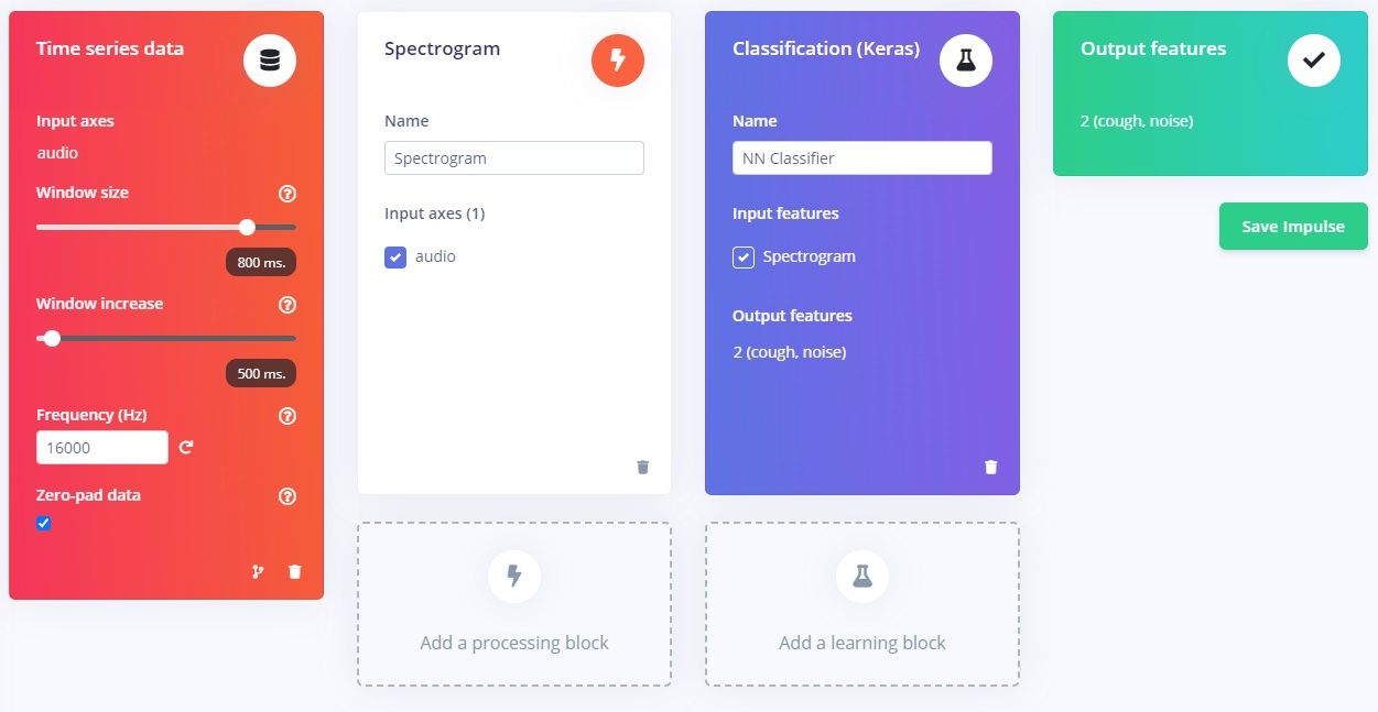 The dataset was uploaded to Edge Impulse Studio using the data acquisition tool, which assigned each sample a label automatically, and split the samples into training and test sets. Next, an impulse was created that first preprocessed the audio data by converting it into a spectrogram, which gives a concise snapshot of an audio sample, and also allows the data to be analyzed by convolutional neural networks. The next step in the pipeline was a convolutional neural network that classifies a spectrogram as being either the result of a cough, or random background noise.