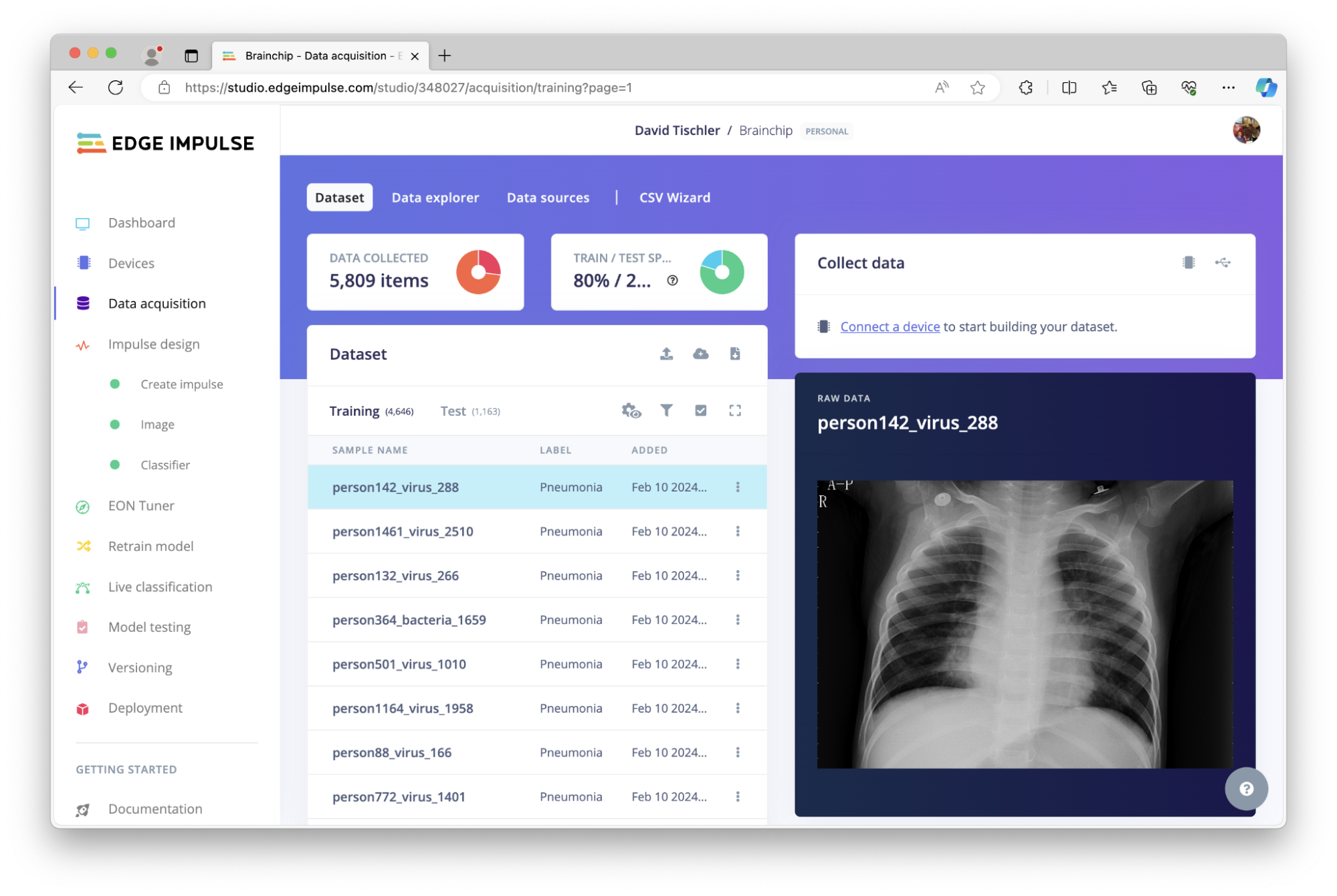 Fortunately, advances in edge computing hardware and AI algorithms may soon solve many of these problems. It is now possible to run powerful AI algorithms on the same small, low-power devices that collect the data that is to be analyzed. To demonstrate just how far the field has come, Edge Impulse’s own hacker-in-residence David Tischler built a proof of concept medical diagnostics system. Using a neuromorphic processor from BrainChip and the Edge Impulse platform, Tischler proved that developing a portable device that can diagnose pneumonia from X-ray images is well within reach.