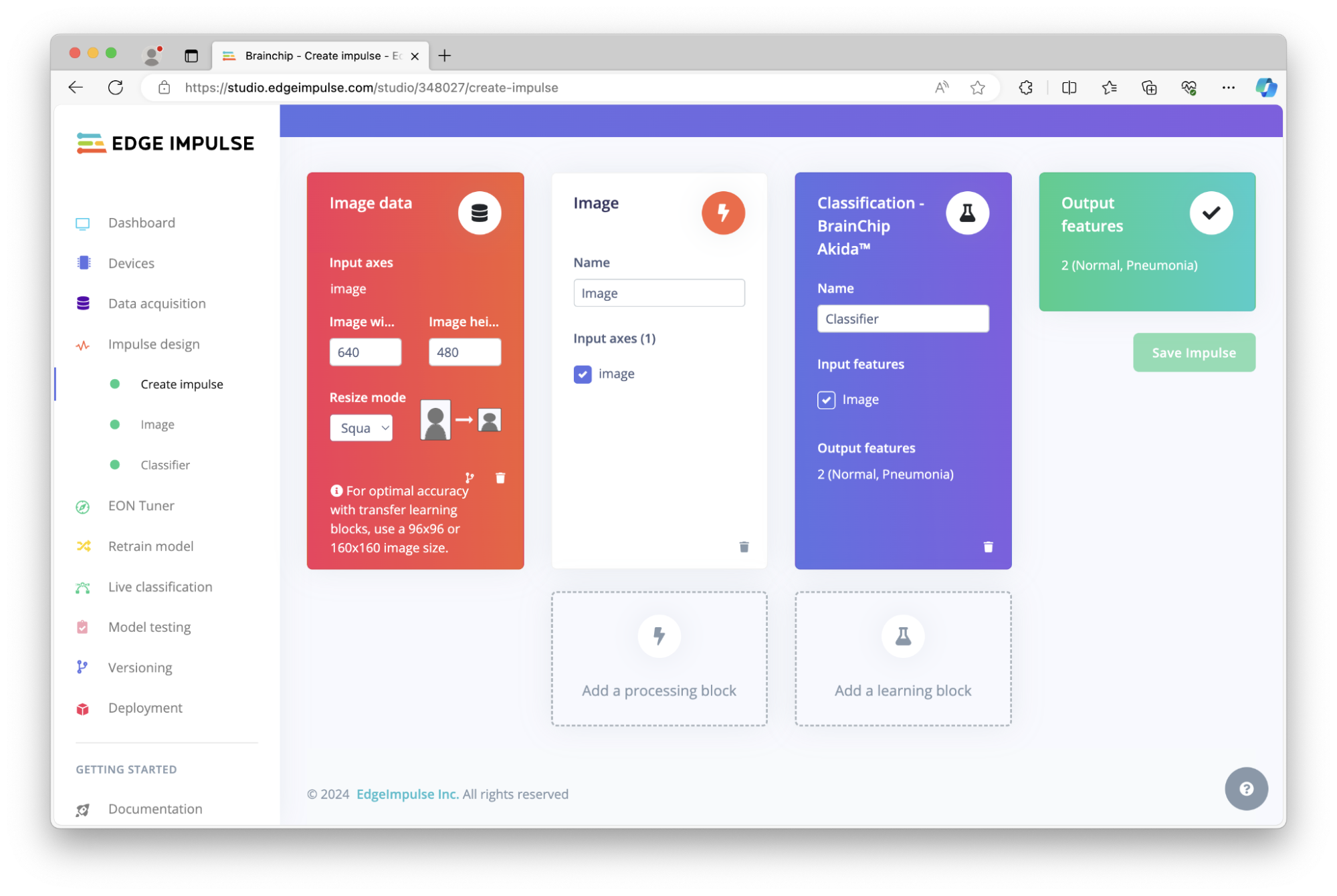 Next up, an impulse was created — this is what defines how data is processed, all the way from the time it is collected up until a classification prediction is made. The first step in the impulse resizes the images to 640x480 pixels to save some compute cycles later in the process, but it was noted that the resolution could be increased if accuracy suffers. An image processing step was then included to extract features from the images, which are then forwarded into a classifier that is tailored to the BrainChip Akida processor. This classifier will predict if an unknown image is either normal, or if it appears that pneumonia is present.