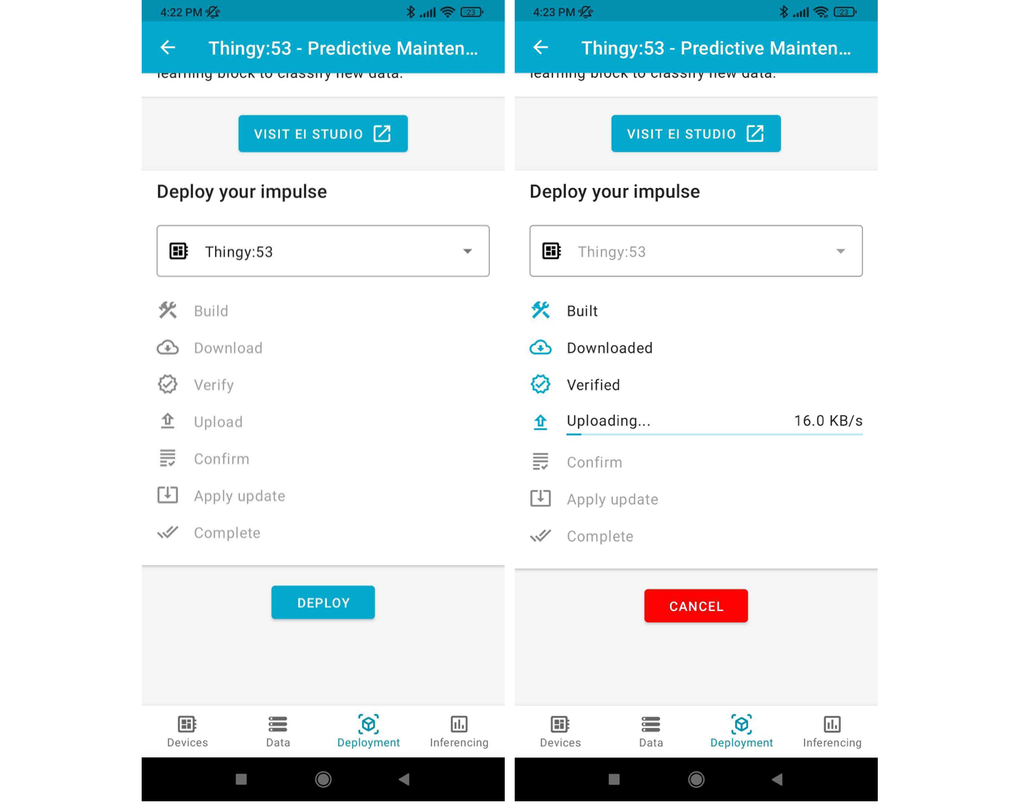 To eliminate the need for any wireless connectivity or cloud computing resources, the full predictive maintenance pipeline would need to be deployed to the Nordic Thingy:53. Since this board is fully supported by Edge Impulse, that was as easy as clicking on the “Deployment” tab, then selecting “Nordic Thingy:53.” From there, the nRF Programmer smartphone app can be used to wirelessly deploy the pipeline to the hardware. As an added bonus, that same app can also be used to view inference results produced as the model runs.