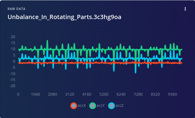 Before the machine learning models could be created, Zalmotek needed to collect some data to train them. Specifically, air compressor vibration data, as measured by an accelerometer, would need to be collected during normal operation, and also during any known failure states that are to be recognized. Perhaps the simplest way to collect data from the Nordic Thingy:53 is to install the nRF Programmer app on your smartphone. This app makes it possible to link the device to a project in Edge Impulse Studio, after which data can be collected and automatically uploaded to that project. Using this method, four minutes of accelerometer measurements were recorded to represent “normal operation” and “unbalanced” classes.