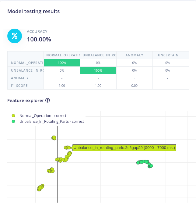 The number of training cycles and the learning rate was adjusted, then the neural network training process was kicked off. A short while later, the results were displayed, which revealed that the model had achieved a 100% classification accuracy rate. That may sound too good to be true, but glancing at the Feature Explorer tool gives some insight into why. There is a very clear separation between the classes in terms of their features, so this is not an unexpected result. But just to be safe, the model testing tool, which validates performance using a set of data excluded from the training process, was also utilized. This validation confirmed the 100% average classification accuracy rate.