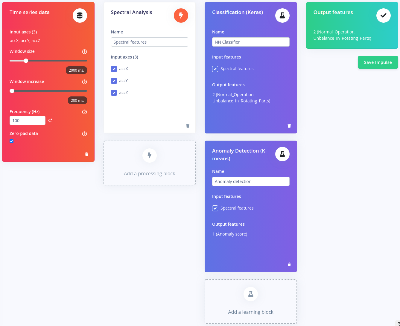 At this point, everything was in place to create the machine learning analysis pipeline, which is the part that many people assume will be too difficult for them to do. But as Zalmotek demonstrated, it is actually very simple using the web-based interface of Edge Impulse Studio to select and configure each processing step. The initial steps split the data into two second segments, then perform a spectral analysis to extract the frequency and power characteristics of the signal — this is especially important when decoding recurrent patterns, such as those found in the vibrations of industrial equipment. The features are finally forwarded into both a neural network classifier and a K-means anomaly detector. The classifier will detect known operational states, and the anomaly detector is tuned to recognize any sort of abnormal state of the machine.