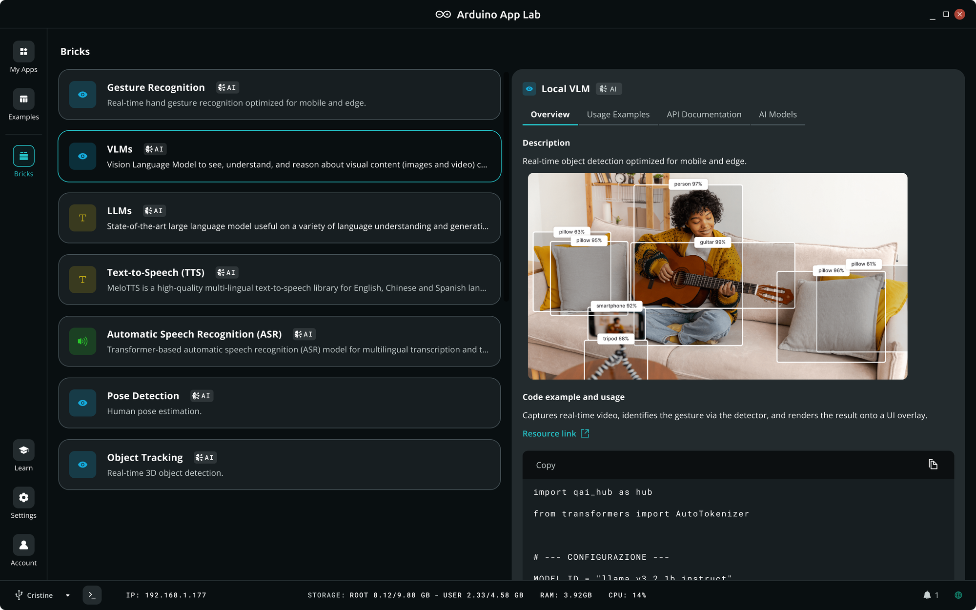 - “Do I have to become an AI expert to use this?” — Absolutely not. If you’re a seasoned ML engineer, you’ll find the workflow speeds up your development. But if you’re a beginner or domain expert with a problem to solve, this integration helps you leverage AI without the steep learning curve. Arduino App Lab’s interface is friendly and visual, and Edge Impulse takes care of the heavy AI lifting through a guided workflow that enables anyone to go from an idea to a solution that works in the real world. You can start from examples of pre-built AI bricks or community projects, then customize your own model when you’re ready, all within a guided environment.