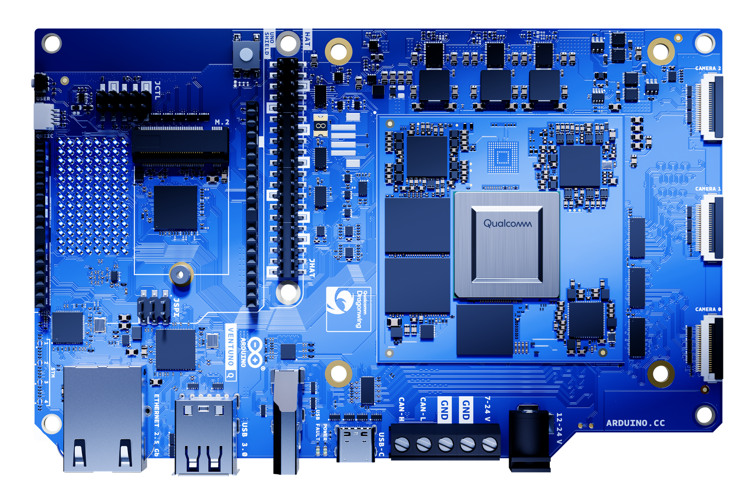 Following on the massive success of the Arduino UNO Q, launched in October 2025, the VENTUNO Q is the next evolution in Arduino’s AI-capable hardware. It features the powerful Qualcomm Dragonwing™ IQ-8275 processor, providing up to 40 TOPS of AI power to run advanced AI models like YOLO-Pro, local LLMs and VLMs, or speech to text pipelines directly on device.