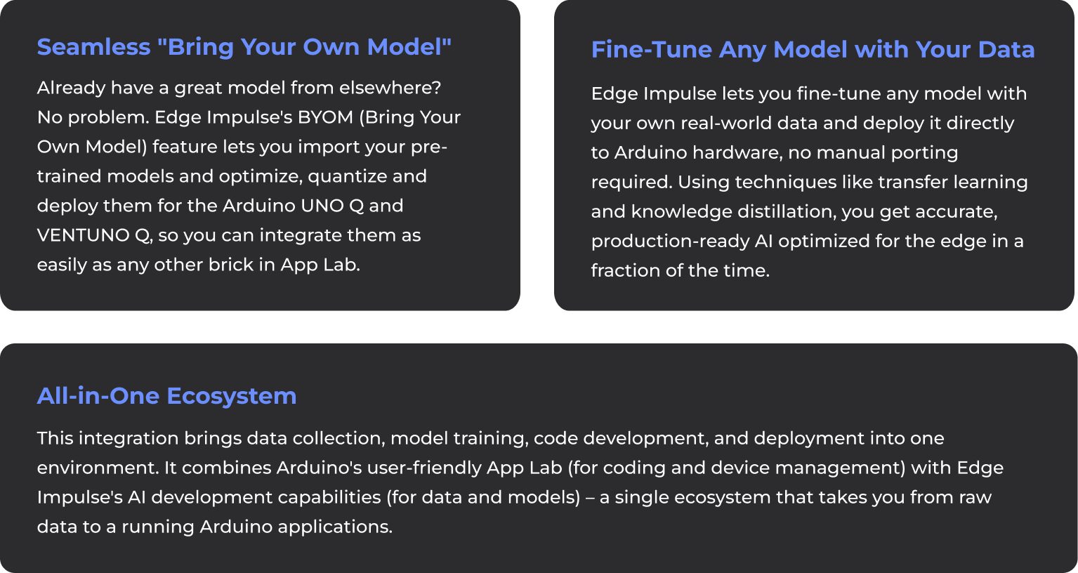 If you’re as excited as we are about the possibilities, there’s never been a better time to jump in. With Arduino VENTUNO Q and UNO Q, along with Arduino App Lab and its Edge Impulse integration, you have a complete pipeline from data collection to model deployment at your fingertips. No need to be an AI guru or an embedded systems expert — if you have an idea and the passion to solve a problem, this new workflow will guide you from start to finish.