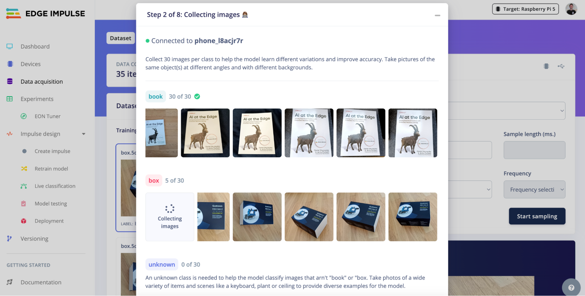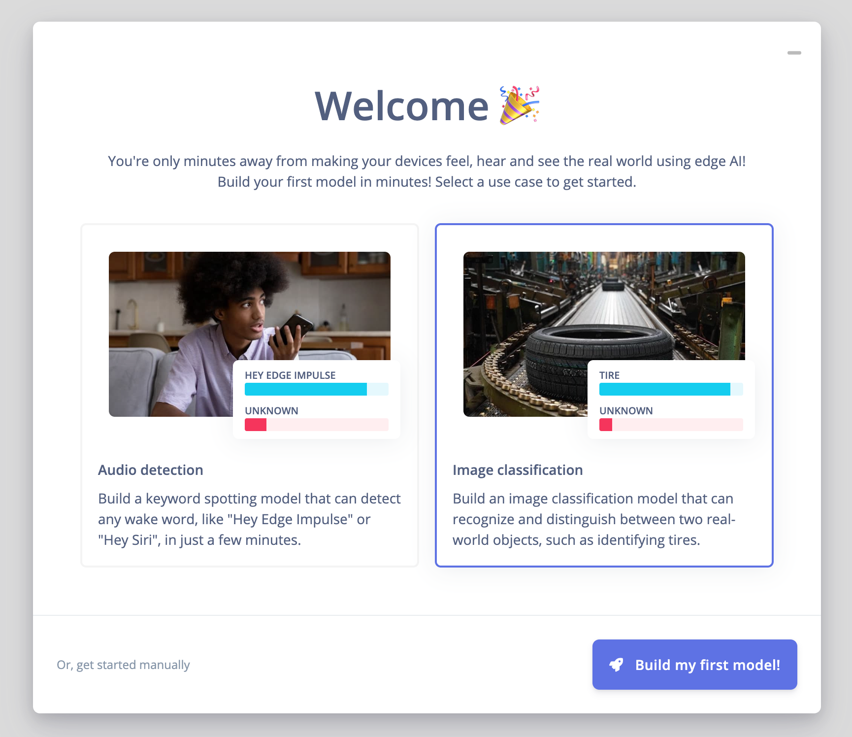You may be familiar with our getting-started wizard for keyword spotting, which allows you to train your first audio model in under 5 minutes. The computer vision walkthrough joins that one as a quick "getting started" feature, designed to bring that same level of simplicity and efficiency to vision-based projects.