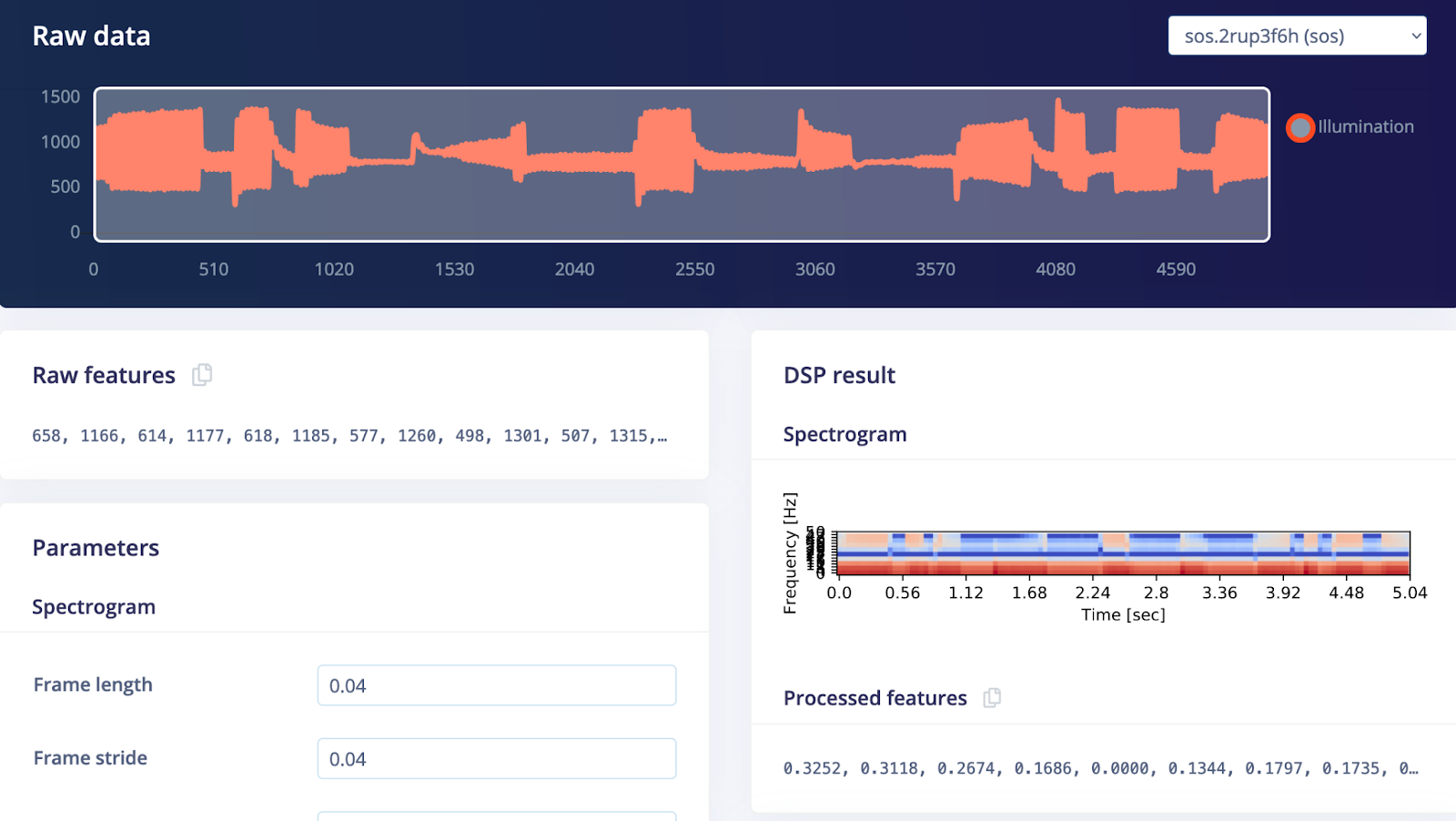 You can play around with different DSP blocks. The one that we used was Spectrogram, since to distinguish SOS signal from other noise we need both information about frequencies/amplitude of the signal and their change in the time window of the sample.