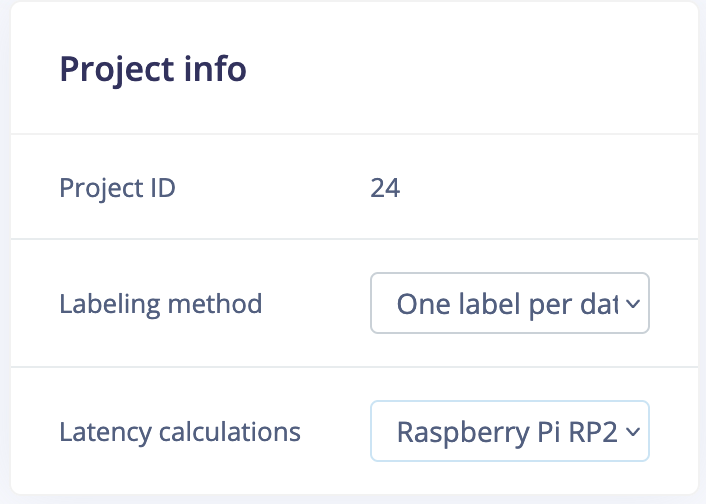 Note: The RP2040 was benchmarked for common ML models. Latency calculations for RP2040 are available to choose in the dashboard under Project Info. You will notice that despite its 133 Mhz maximum clock rate, the latency numbers are higher, than for example for Cortex M4F boards with the same clock rate - that has to do with the fact that M0+ cores lack SIMD (Single Instruction Multiple Data) extensions and hardware floating-point units, therefore they are less efficient when it comes to DSP, but are comparable for running INT8 quantized models.
