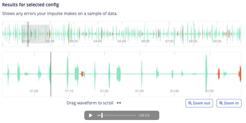 Performance can be measured using either recordings of real-world data, or with realistic synthetic recordings generated using samples from your training dataset. This allows you to easily test your model’s performance under various scenarios, such as varying levels of background noise, or with different environmental sounds that might occur in your deployment environment.