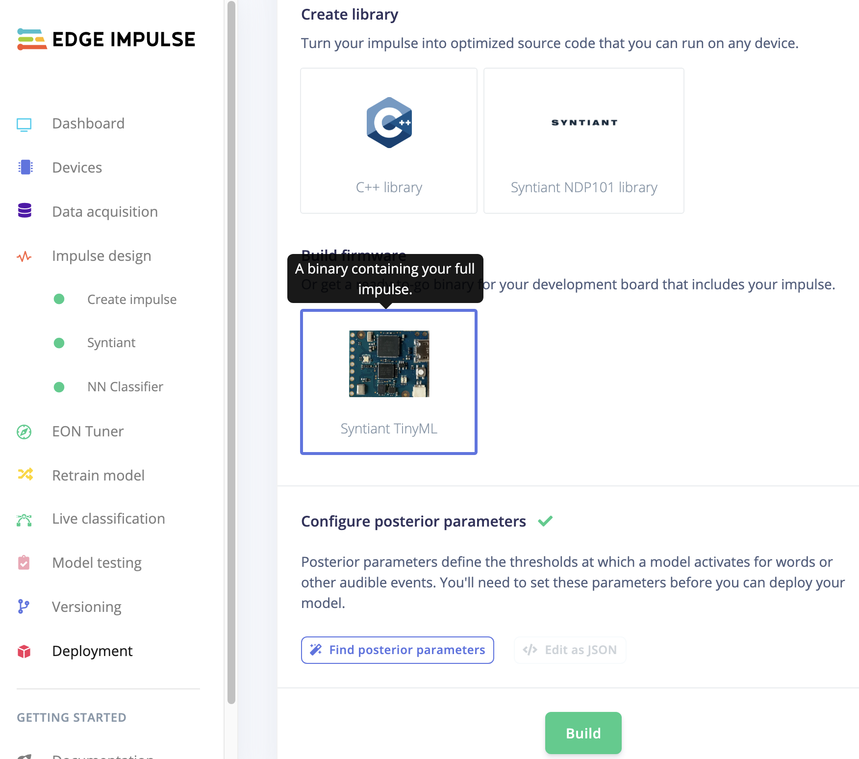 - Go to the Deployment tab of your Edge Impulse project, then build and download a ready-to-go binary that includes your machine learning model for the Spresense; or deploy as a NDP101 library and integrate the model into your own firmware!