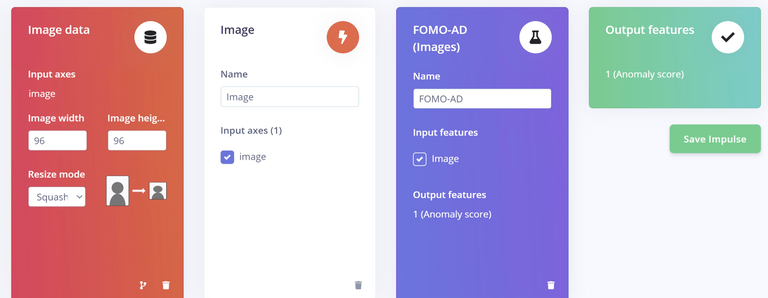 With the data in hand, it was time to build the impulse, which defines how data is processed. From the time that the camera captures an image until the moment that the machine learning algorithm makes a prediction, the impulse runs the show. For this application, the impulse first reduces image sizes, which has the effect of minimizing the amount of computations that are needed by downstream steps. It then forwards image features into the FOMO-AD algorithm. This learns what normal objects look like during training so that it can output an anomaly score, predicting the likelihood that an anomaly exists.