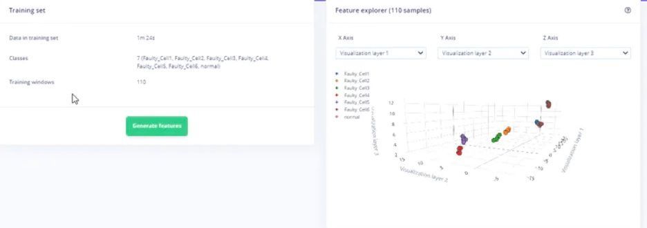 Features were generated for the raw thermal data to pick out the most important factors in the data, and also to reduce the computational resources needed for the rest of the analysis. The next step in the impulse is a convolutional neural network classifier that can predict if the battery pack is operating normally, or if one of the particular cells (1 through 6) have gone bad. The model was trained, then tested against a dataset that was not included in the training process. This test showed that the model is able to classify the battery pack state correctly 87.5% of the time. That is quite a good result, and with a bit larger dataset, this accuracy would be expected to improve further.