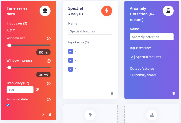 After a small dataset was collected to prove the concept, it was uploaded to Edge Impulse Studio using the data acquisition tool. Next, an impulse was created to process the data all the way from raw sensor measurements to predictions from a machine learning model. This process was initiated by slicing the accelerometer data into 500 millisecond windows, then performing a spectral analysis to extract frequency and power characteristics from the signal. This is an excellent way to prepare sensor data containing many repetitive patterns, as is often the case with accelerometer measurements.
