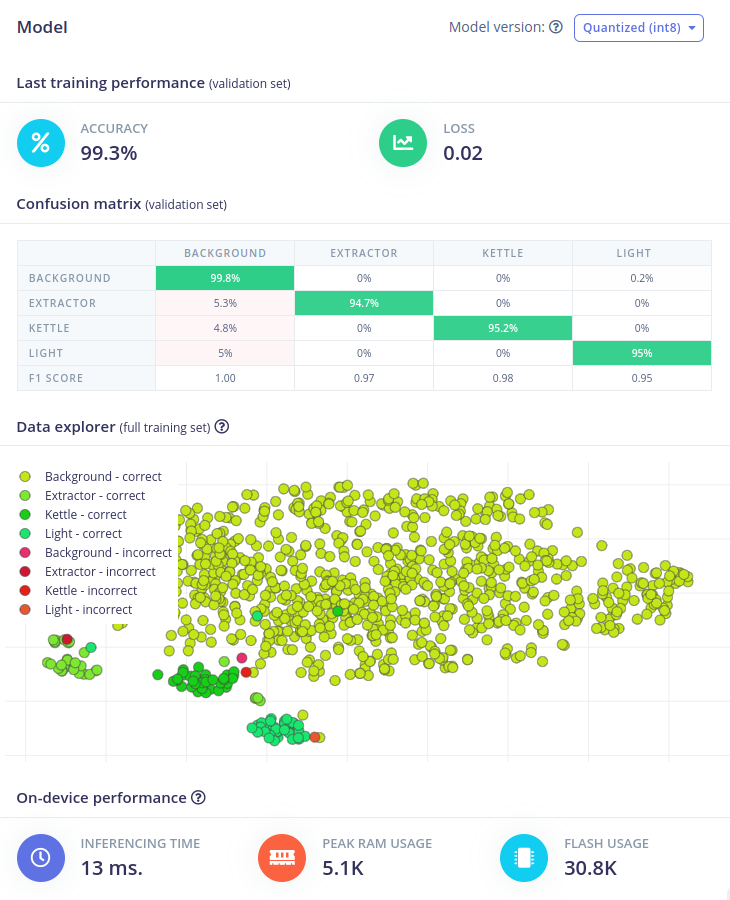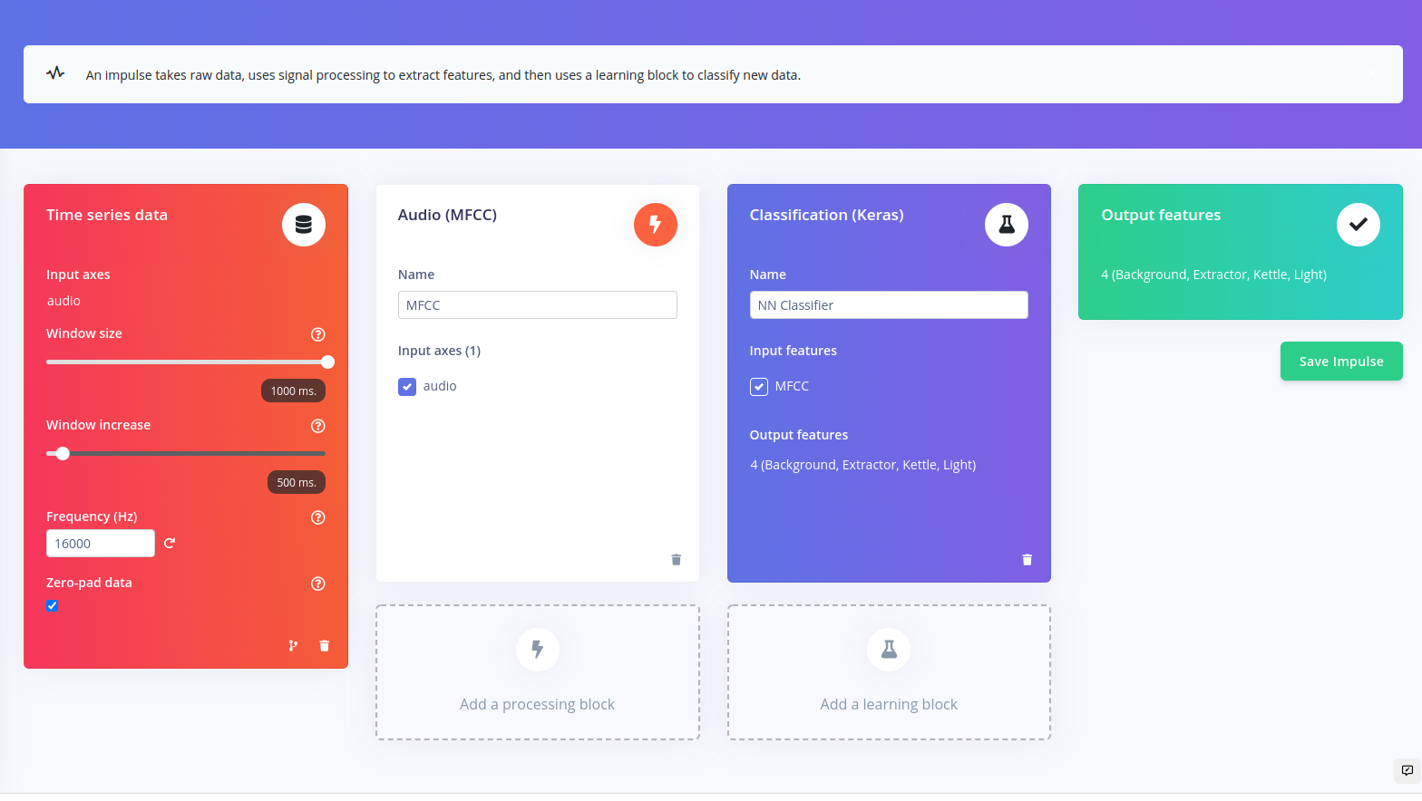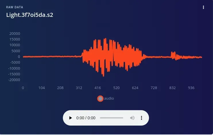 Since one of Zalmotek’s stated goals is to customize the voice recognition system to individual users, they got started by collecting recordings of themselves. After flashing a custom firmware image to the Nordic Thingy:53 and installing the Edge Impulse CLI, the device was linked to an Edge Impulse Studio project. Now any data collected from the on-board microphone would automatically be uploaded to Edge Impulse to use as training data for the model. Initially, the team decided to focus on recognizing the keywords "light," "kettle," and "extractor" to control the corresponding appliances. Additionally, samples of ambient background noises were collected to signify when no voice commands are being issued.