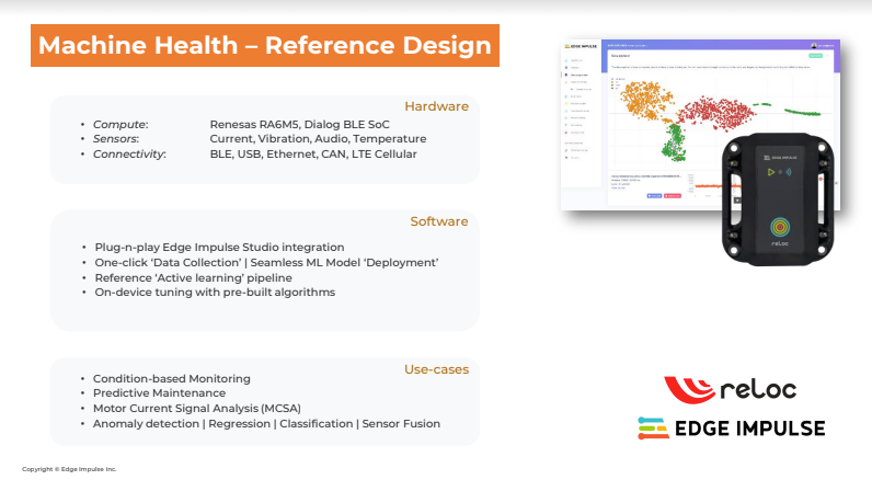 Also at the booth: Meet BrickML, the first product based on the Edge Impulse “Industrial Monitoring” reference design, focused on providing machine learning processing for industrial/machine monitoring applications. Built in collaboration with Reloc and Zalmotek, BrickML can be used to track numerous aspects of industrial machinery performance via its multitude of embedded sensors. We’ll be showing it in a motor-monitoring demonstration. BrickML is fully integrated into the Edge Impulse platform which makes everything from data logging from the device, to ML inference model deployment on to the device a real snap. (Our Industrial Monitoring reference design includes hardware and software source code to rapidly design your own product, available for Edge Impulse enterprise customers.)
