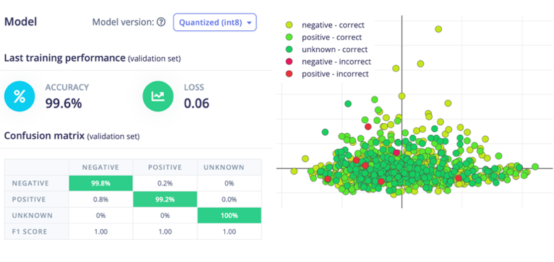 At this point, everything was in place for the surface crack detector, but how did it work? Kumar used the Feature Explorer tool as a first step to make sure the data appeared to cluster well within groups. The results were encouraging, so the model training process was initiated. After training finished, metrics were provided to help in further assessing the model’s performance. The average classification accuracy had already reached 99.6% on the first try. This did not leave much room for improvement, so it was time to wrap the project up.