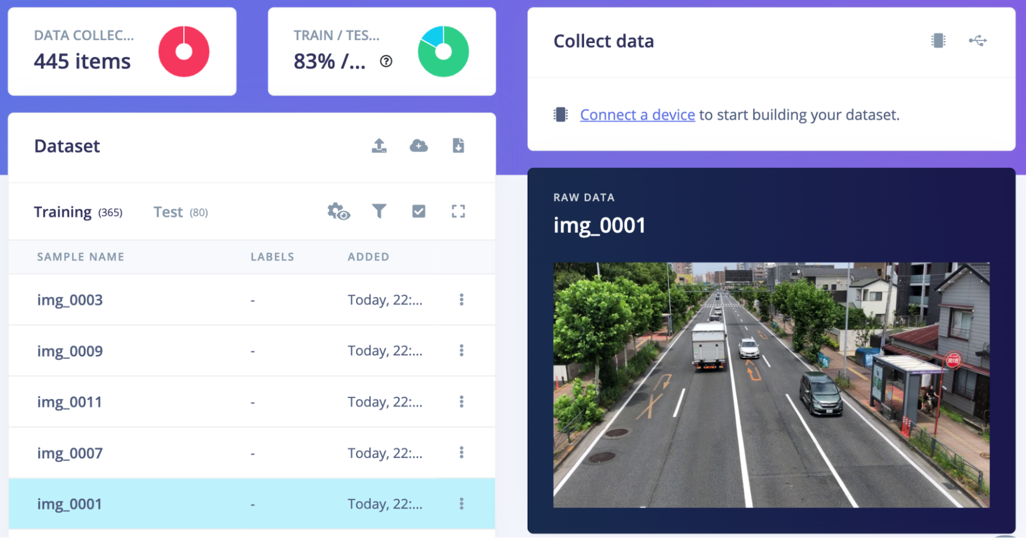 After deciding that an object detection algorithm would be the best tool for the job at hand, Kumar started building a dataset to train it. A number of videos were captured from atop a pedestrian bridge using a smartphone camera. Individual frames were then extracted from the videos before they were uploaded to an Edge Impulse project using the Edge Impulse CLI. In total, about 440 images were collected and uploaded.
