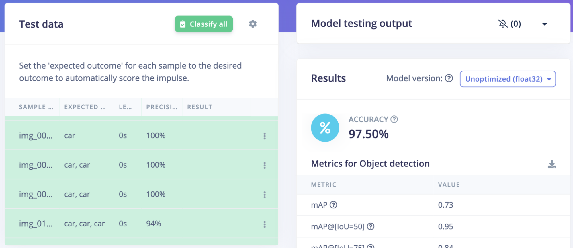 The previously collected dataset was then used to train the model with the click of a button. After a short time, the training process was finished and metrics were shown to help in assessing how well the model was performing. A precision score of 97.2 percent was observed, which is excellent, especially considering that a relatively small amount of training data was utilized. It is always a good idea to also use the Model Testing tool as well to validate that result. Since this tool uses data that was not included in the training process, it can confirm that the model was not simply overfit to the training dataset. In this case, an accuracy score of 97.5 percent was achieved, which closely mirrors the reported training accuracy.