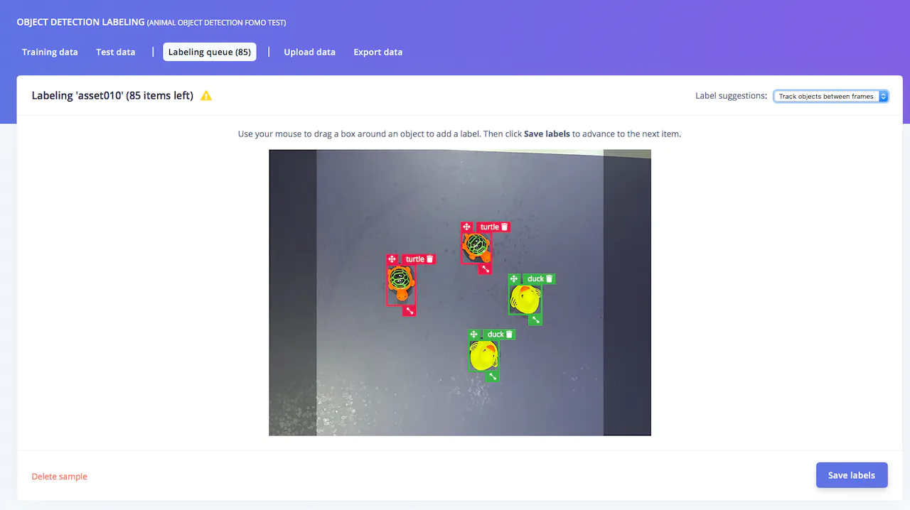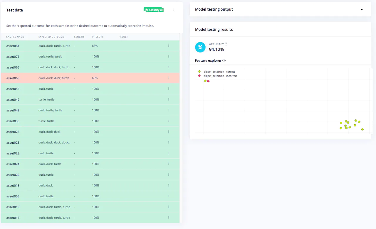 After collecting these images, they were uploaded to Edge Impulse Studio. The labeling queue tool enabled bounding boxes to be drawn around the animals in the images quickly by using machine learning (go figure!) to suggest where the boxes should be. This labeled data was then used to train the FOMO algorithm. The resulting model was then validated on a set of images that it had not previously seen. It was found to be better than 94% accurate in detecting the animals present in the images. Not bad for an afternoon’s work.