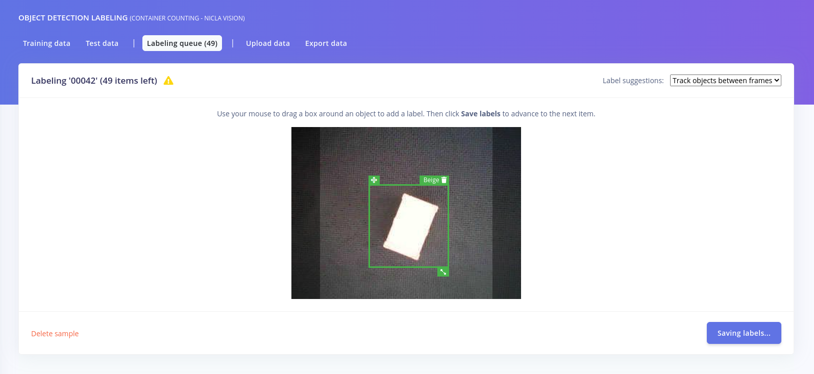 A bit more metadata was still needed before wrapping up the data collection phase of the project. Object detection models need to know exactly where in each image the objects of interest are. This information needs to be supplied by drawing bounding boxes around the objects in each image, which can be done using the labeling queue tool. Fortunately, this tool provides AI-powered label positioning suggestions to help with the task, so one only needs to review the suggestions and occasionally make a slight adjustment. This can save a lot of time, especially for larger datasets!