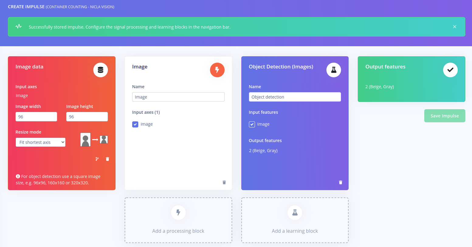 The most important, and arguably the easiest, part of the project is the creation of the impulse, which defines the processing of the data all the way from raw sensor measurements to predictions. And with the data all squared away, Zalmotek was ready to define their project’s impulse. Using Edge Impulse Studio’s web interface (as opposed to the recently announced Python SDK for power users), preprocessing steps were added to resize the images and extract the most informative features. These features were then forwarded into a FOMO object model designed to recognize two types of containers.
