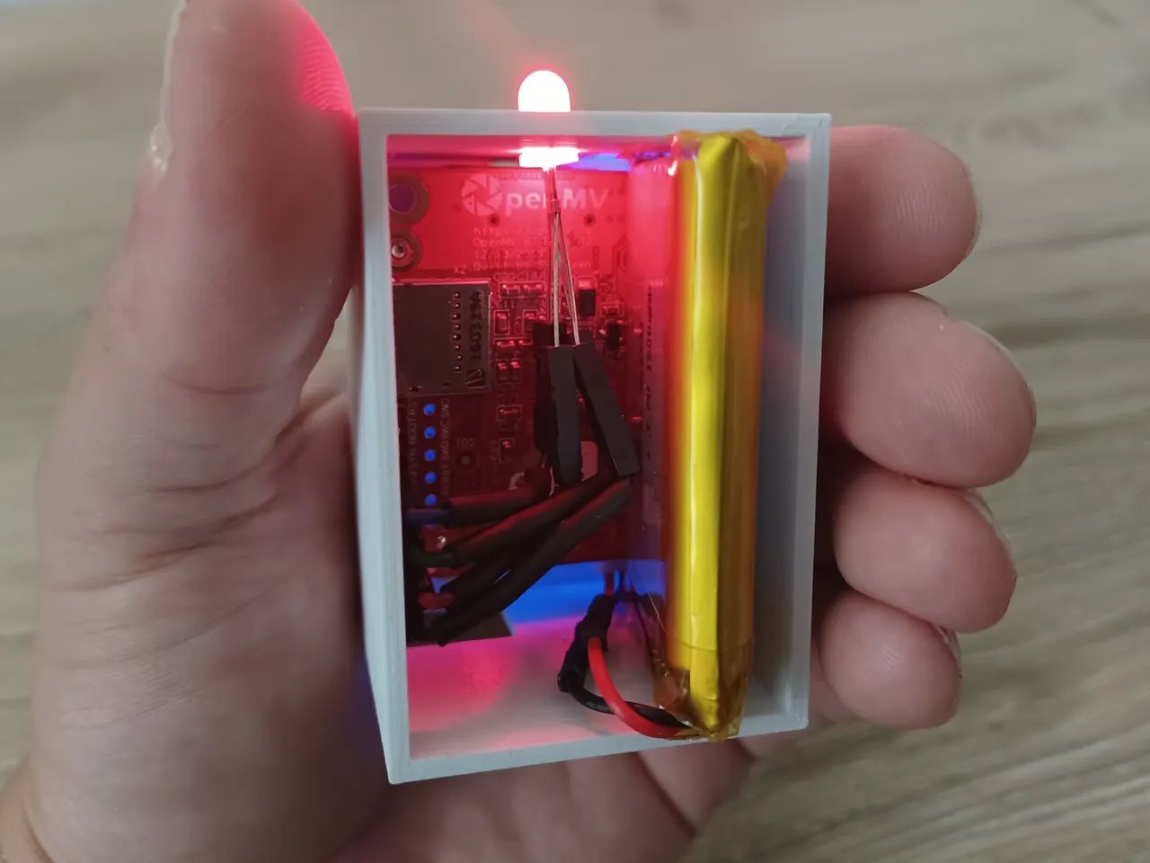 Hammell’s prototype device consists of an OpenMV Cam H7 Plus board, which provides both computational resources and an image sensor. This is fitted into a custom 3D-printed case along with a LiPo battery and an RGB LED. The device is attached to a 3D-printed stand, which is placed at ground level, where it can get a good view of the tires of any vehicles that pass by. When the device is powered on, it begins executing a loop in which images are captured, then classified by a machine learning model, and finally, the color of the LED on top of the case indicates the inflation level of the tire.