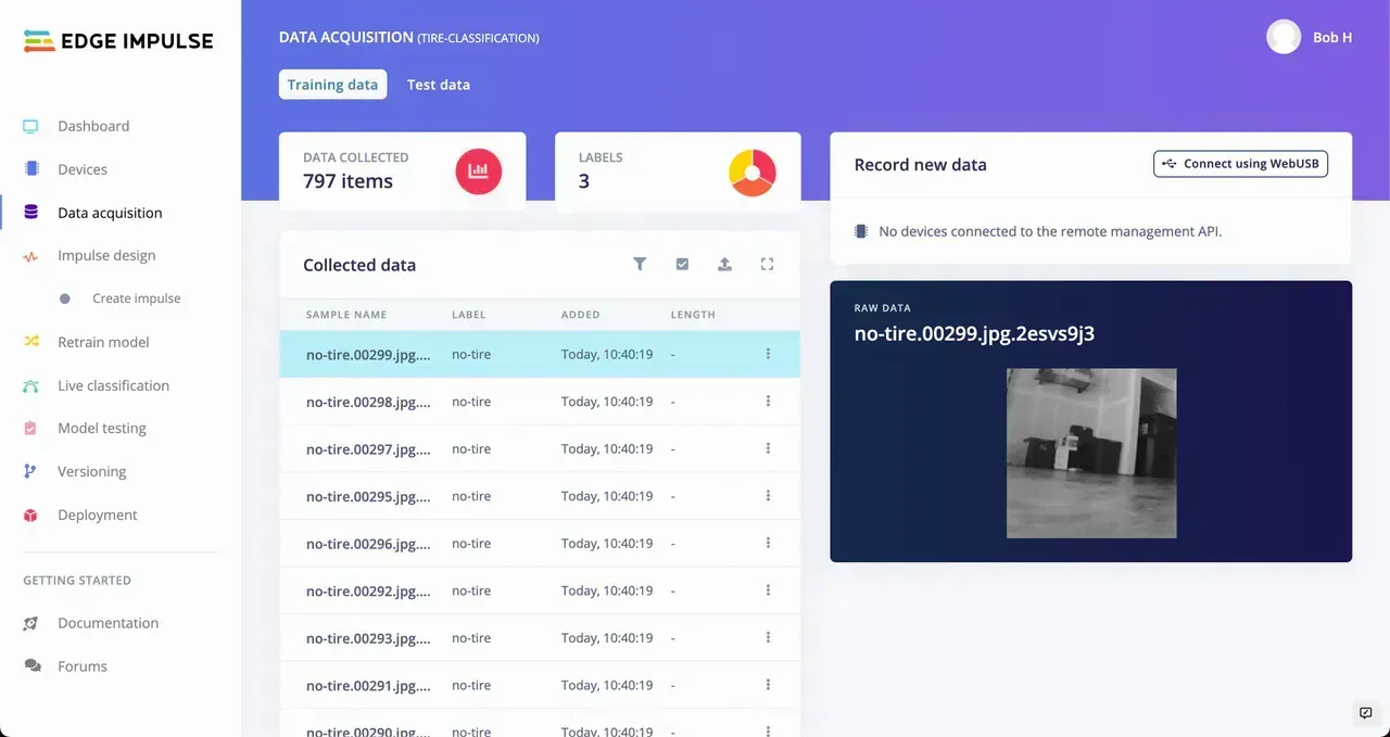 OpenMV IDE was used to capture images of tires, at differing levels of inflation, with the OpenMV Cam. Hammell was sure to collect a wide variety of images for each class, “full,” “flat,” and “no tire,” to ensure that the classifier would work well under real-world conditions. This dataset was seamlessly loaded into a new project in Edge Impulse by linking OpenMV IDE to an Edge Impulse account. With the dataset uploaded, it was time to pivot over to the Edge Impulse interface to design the data processing pipeline.