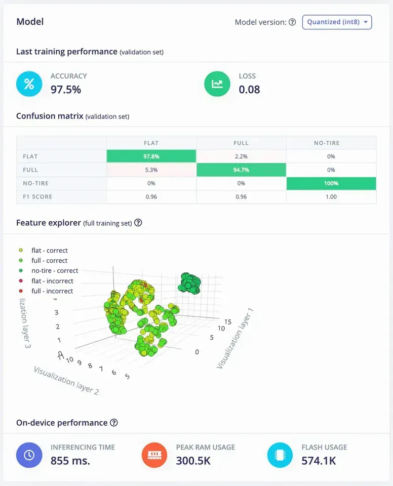Running this model locally on the OpenMV Cam was as simple as clicking on “Deployment” in the Edge Impulse navigation menu and downloading a zip file. These files were copied to the device over USB, along with a custom Python script, and everything was ready to go. Whenever a tire with low pressure is detected, the LED turns red to visually alert an inspector. Similarly, the LED turns green when the tire pressure is looking good.