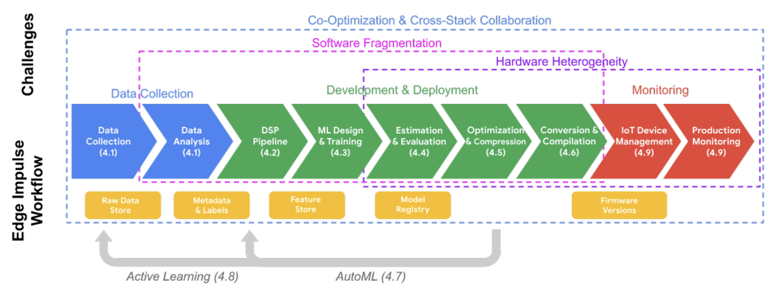 - Software fragmentation: Along with vendor-unique libraries, the current pipeline of edge ML development requires a stack of various tools and techniques to collect data, train a model, and deploy it to a target system.