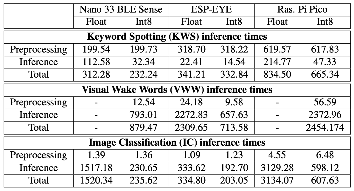 In addition to outlining these features, we test various hardware platforms to demonstrate how well these various optimization techniques perform. In Edge Impulse, we replicated three tasks from MLPerf™ Tiny: keyword spotting, visual wake words, image classification. From there, we deployed each project to the Nano 33 BLE Sense, ESP-EYE, and Raspberry Pi Pico. The preprocessing and inference times are given in the following table.