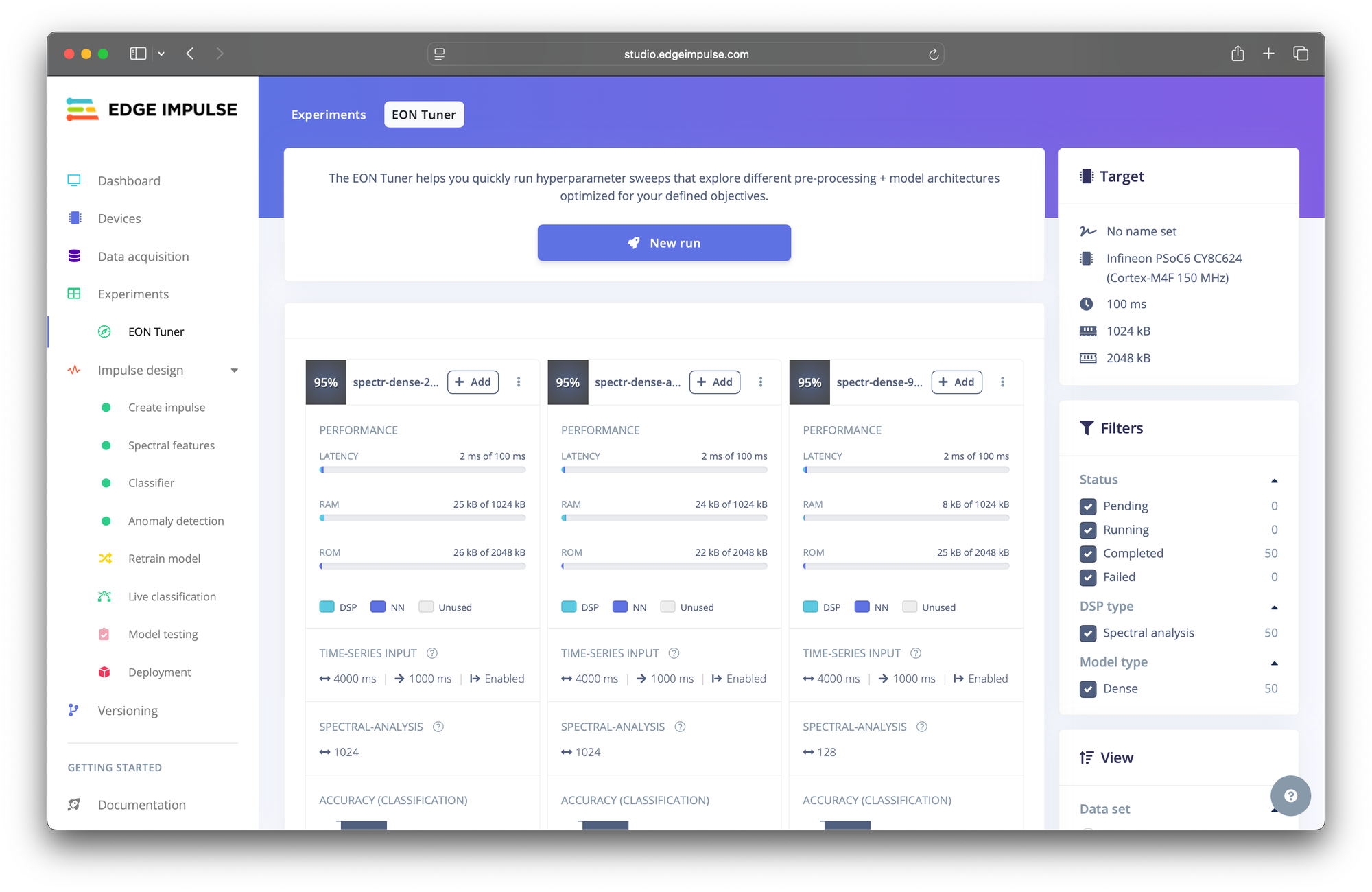 The EON Tuner is a powerful engineering tool that helps you find and select the best performing impulses for your application, given your hardware target resource constraints like RAM, flash, and inference time. This saves you the time and effort of manually creating experiments and allows you to explore a parameter search space more efficiently.