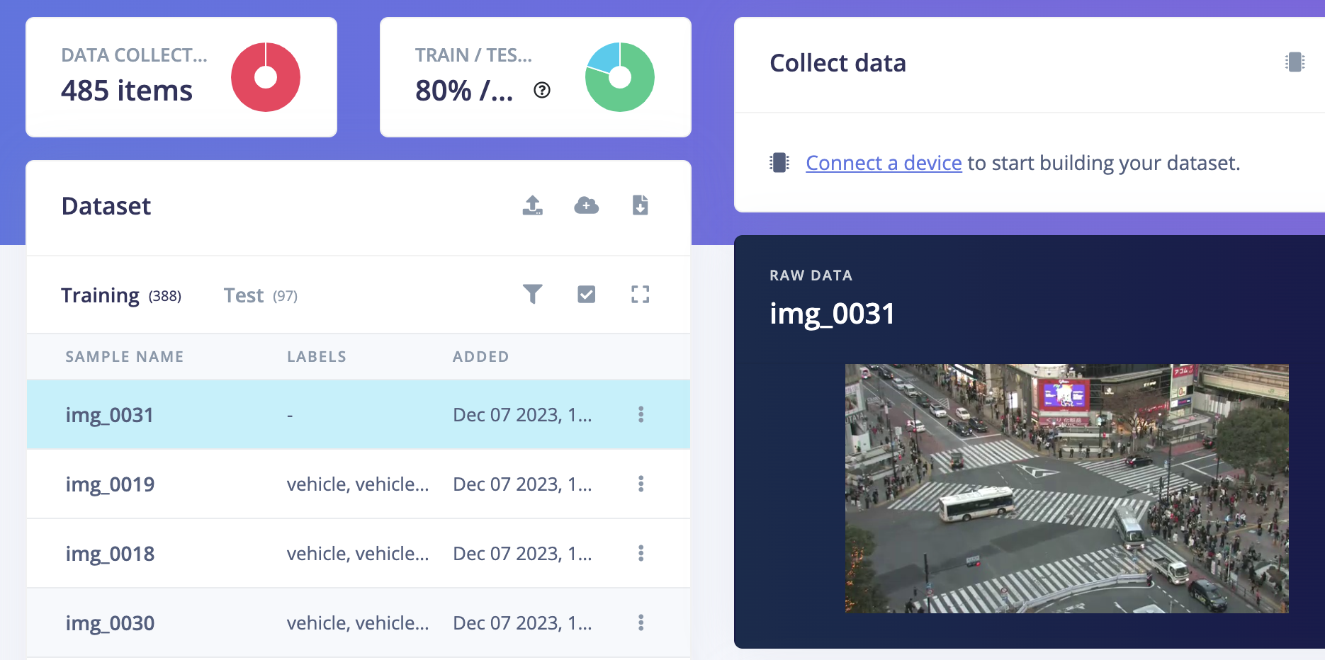 As a first step, Kumar decided to focus on a critical component of any traffic camera setup — the ability to locate vehicles in real-time. After setting up the hardware for the project, it was time to build the object detection pipeline with Edge Impulse. To train the model, Kumar sought out a dataset captured by cameras at Shibuya Scramble Crossing, a busy intersection in Tokyo, Japan. Still image frames were extracted from videos posted on YouTube, and those images were then uploaded to a project in Edge Impulse using the CLI uploader tool.