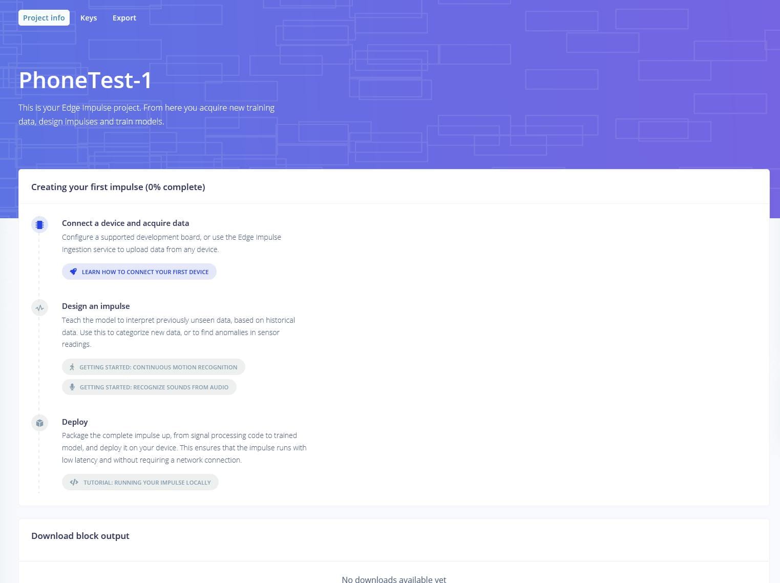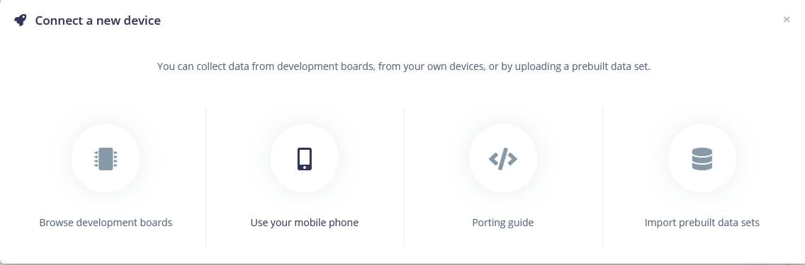 After entering in your information and verifying your email, you will be greeted by a getting started page. This will walk you through the process of connecting a device, gathering data, and finally deploying a model. I named my first project PhoneTest-1, but it can be anything you like.