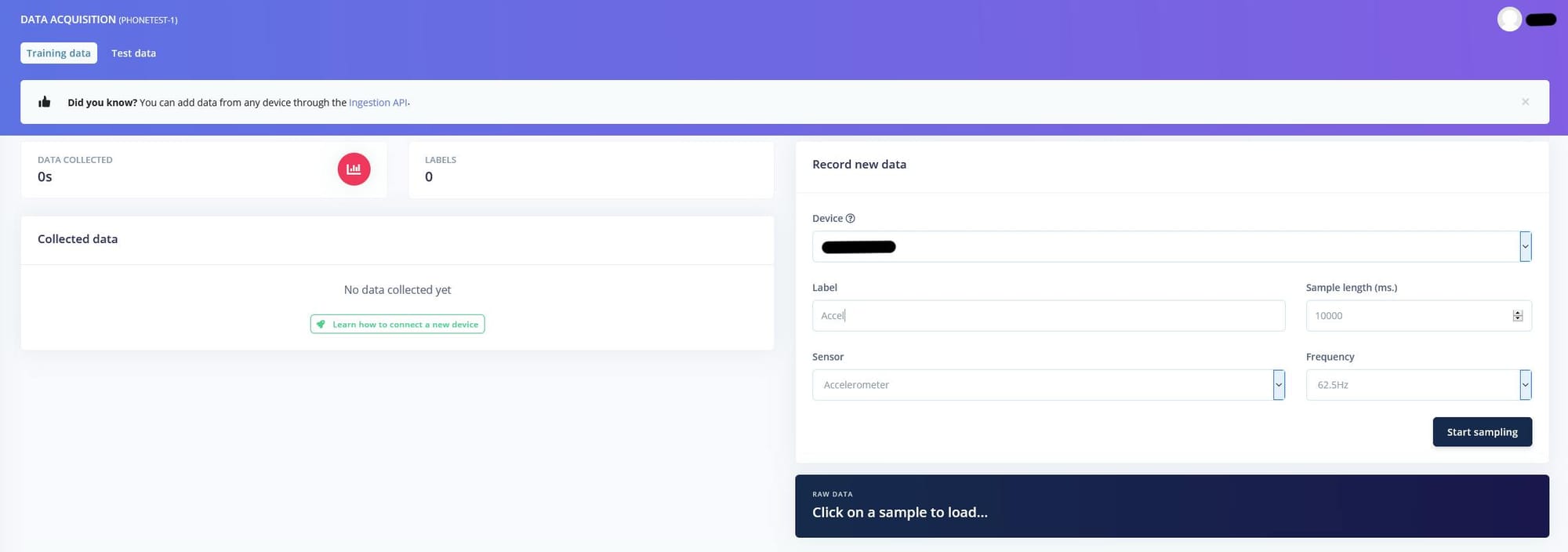 Now it’s time to really dive in and create a model. But first, there has to be data to train it on. Make sure you have your phone handy because you’ll be using its sensors to capture the data. To begin, go to the data acquisition tab and make sure your phone is selected. Choose the accelerometer sensor and frequency and then click "Start sampling." After you are done moving your phone, you can view the collected data in a graph.