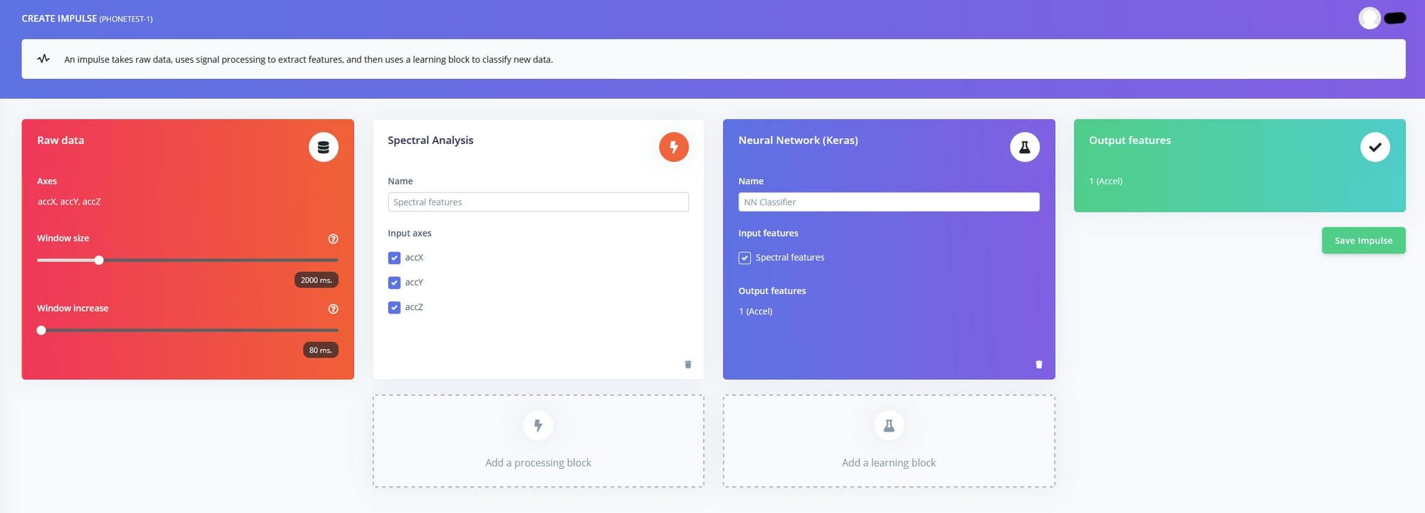 Since you have some data recorded, it’s time to train a model from it. Go ahead and navigate to the "Create Impulse" page and select the recommended Spectral Analysis processing block and a Keras Neural Network learning block. Then go ahead and save the impulse.