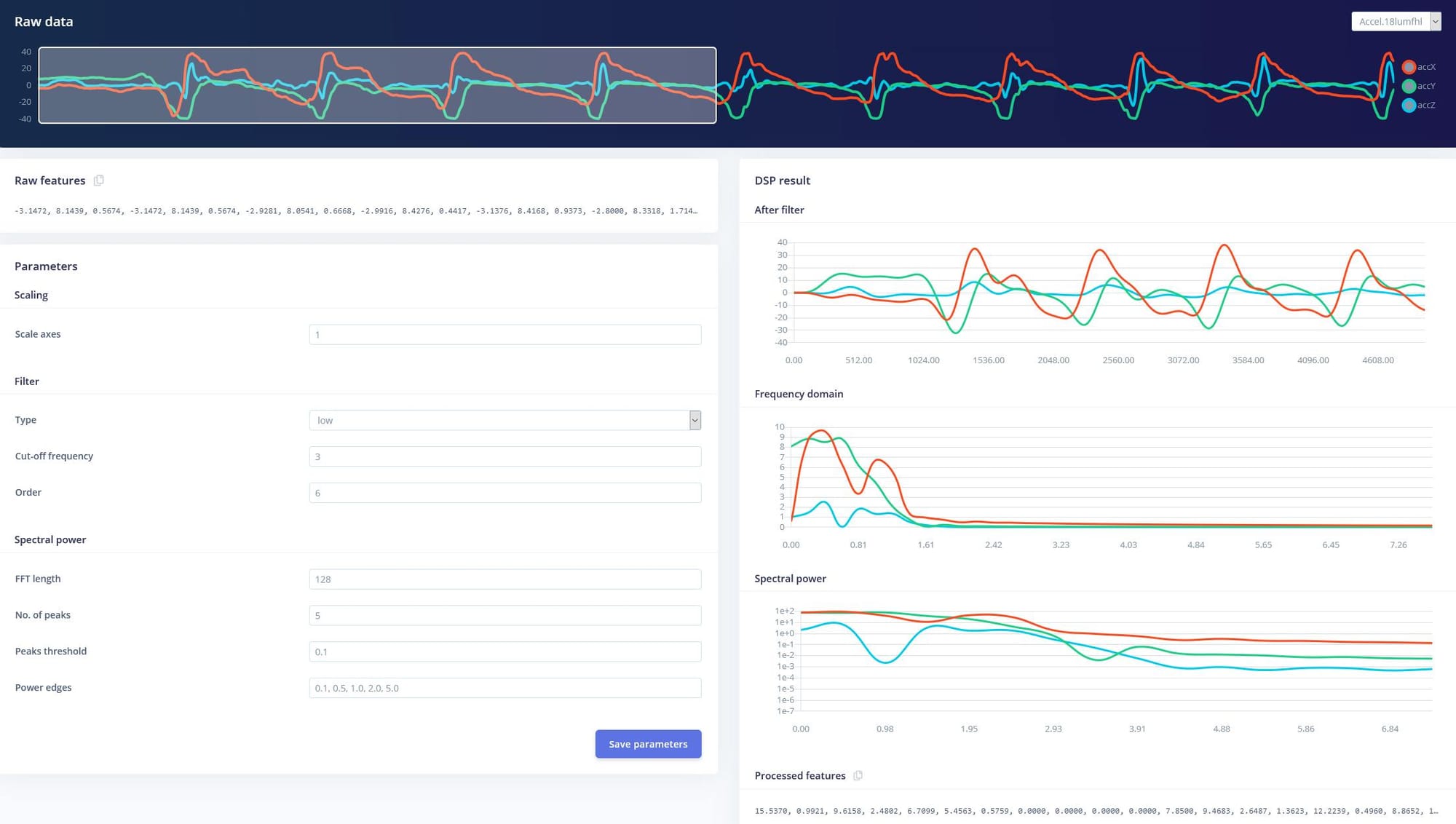Next, set up your data’s scaling, filter, and FFT settings. These will control how your data gets pre-processed before being sent into the NN. After doing that, view and generate the features.