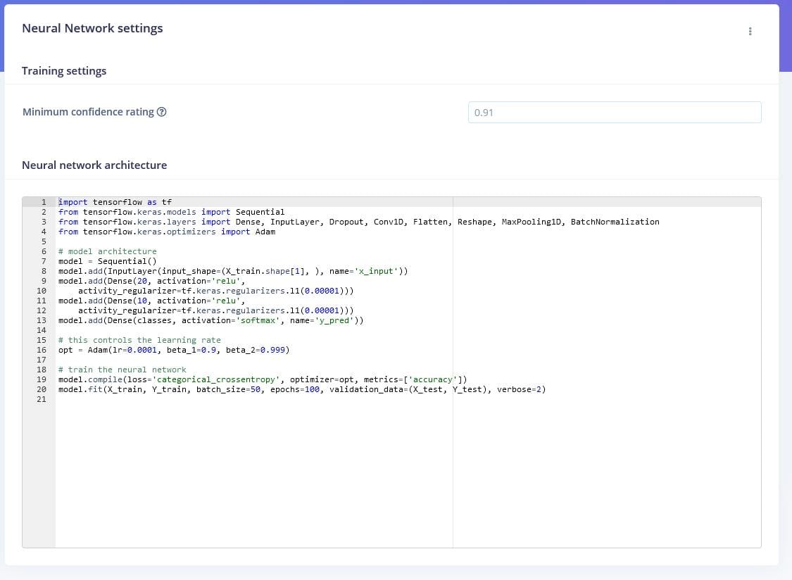 TinyML is a service by Edge impulse that allows for the easy creation of these models by simply connecting a microcontroller to their service, clicking a button, and then deploying it after their servers do the heavy lifting. Their drag-and-drop interface makes it a breeze to add more sensors or learning capabilities.