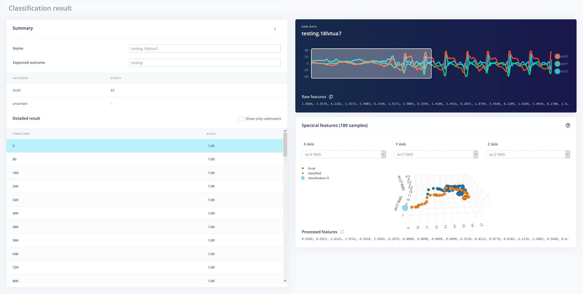 On the NN settings page, I decided to change the default confidence threshold from 80% up to 91%. After training the model, I was able to view a graph of what the model came up with. Then I went to the "Classification" page and gathered a bit more data from my phone and saw what the model was able to detect.