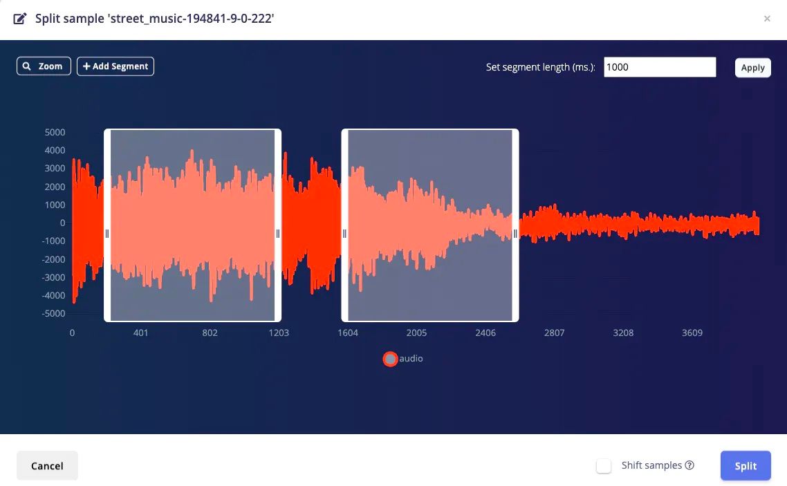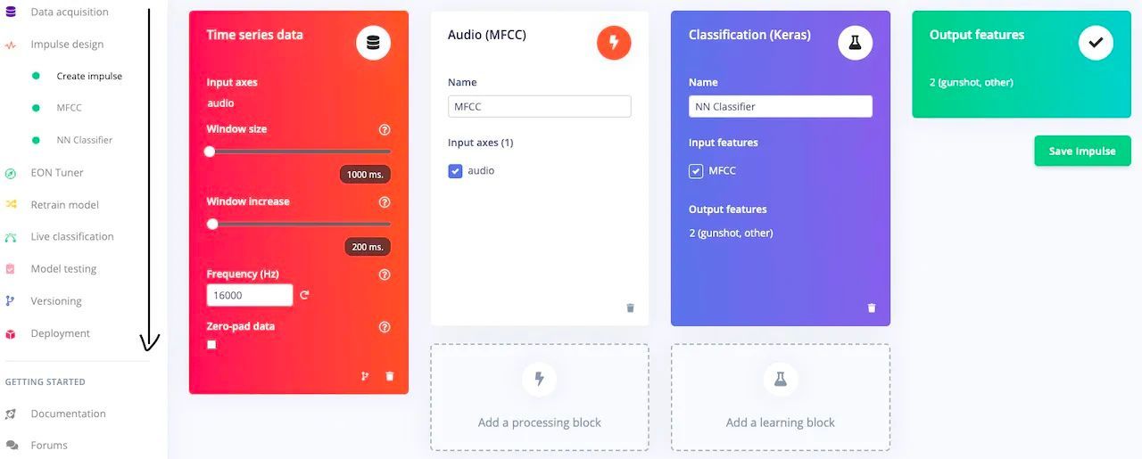Before Verma could build the machine learning model, he would need a source of example gunfire sounds for training purposes, so he got out his collector’s edition Rambo DVDs and started recording. Well, we cannot exactly confirm that, actually... but we do know that he definitely used Kaggle’s gunshot audio dataset for positive examples, and the UrbanSound8K dataset to serve as a source of background noises. Audio files from these datasets were uploaded to Edge Impulse Studio using the data acquisition tool, which automatically assigned labels and split the data into training and testing sets.