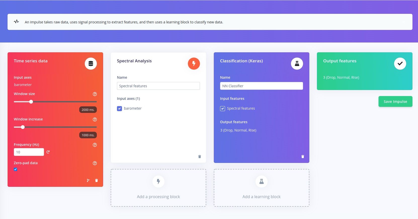 An impulse was created for the weather prediction model that started by slicing the pressure sensor data into windows, then performing a spectral analysis. The spectral analysis removes noise and extracts frequency and spectral power data. The preprocessed data was then forwarded into a neural network classifier that predicts if the weather is likely to be fair or take a turn for the worse. The model training process was started, and after a short time, a confusion matrix was displayed to help assess the model’s performance. The training accuracy was observed to be 100%, and that can be a sign of overfitting, so a more stringent test was performed using data that was not included in the training process. This test also showed an average classification accuracy of 100% had been achieved. This is a bit suspicious until taking a look at the Feature Explorer tool — the data for the classes is very well separated, so the observed accuracy does not appear to be unreasonable.