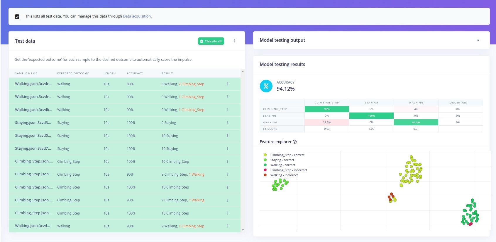 A second impulse, very similar to the first, was created for activity prediction. In this case, incoming accelerometer measurements were divided into segments, then a spectral analysis was performed. The spectral features were fed into a neural network for classification. After training this model with the previously uploaded data, a classification accuracy of better than 98% was observed. This result was double-checked with the model testing tool which confirmed this excellent result with a 94% average classification accuracy.