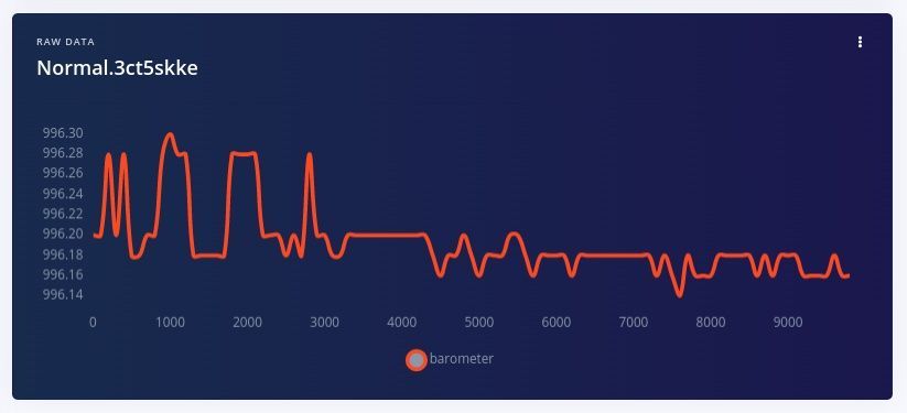 Changes in barometric pressure have long been known to influence the weather, so the team first set out to collect data from the Nicla Sense ME’s pressure sensor and correlate it with conditions of rising or falling barometric pressure, or with stable weather conditions. Using the Edge Impulse CLI, the Arduino was linked to an Edge Impulse Studio project, and data was automatically uploaded. Using the same approach, data was also collected from the accelerometer while walking, climbing, or staying still to be used in training an activity detection model.