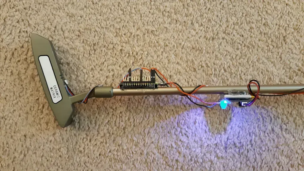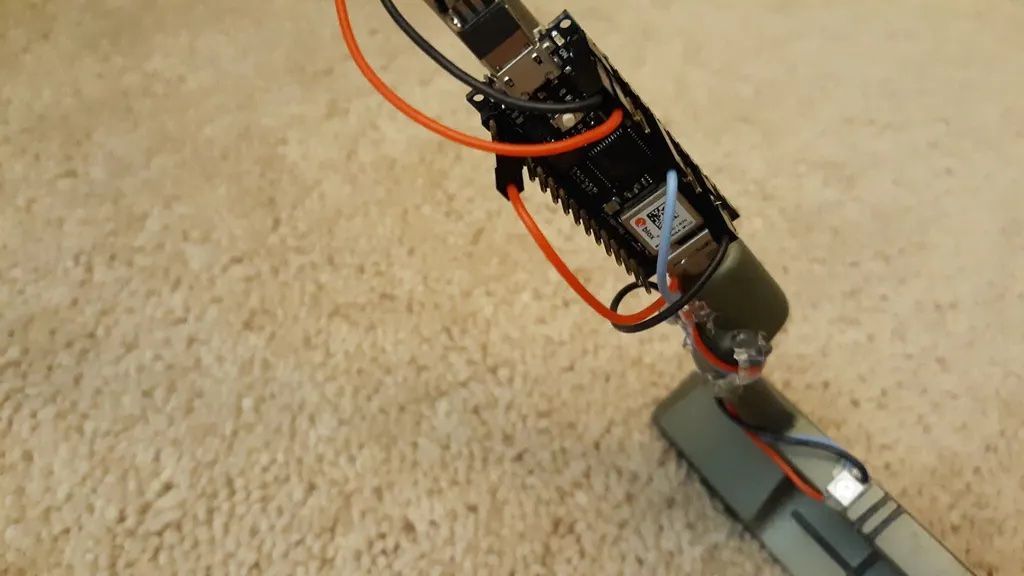 I chose an Arduino Nano 33 IoT board to power this system because of the low cost, tiny form factor, Arm Cortex-M0+ processor, and onboard accelerometer. For the prototype, I hot glued the Arduino near the head of a putter. I wired this board up to an RGB LED that I attached to the top of the putter head, such that it is visible to the golfer during use. A pushbutton was attached to the handle of the putter, where it can be reached while putting, and I also wired that to the Arduino. The entire system is powered by a rechargeable 400 mAh LiPo battery and a power boost converter.