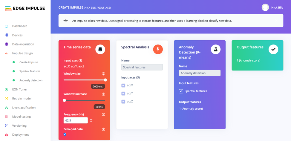 In order to recognize what a particular golfer’s putting form looks like, a K-means anomaly detection model was built with Edge Impulse. I collected accelerometer data that was captured while putting with good form, and uploaded it using the data acquisition tool. Ideally, this dataset would be collected from professional golfers, allowing Golf Ace users to choose a putter that teaches them to putt like their favorite pro. Unfortunately that was not an option for me, so I had to supply the training data myself to prove the concept.